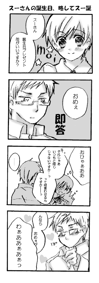 スー誕絵チャありがとうございましたぁあ!!みなさんとスー誕を祝えて楽しかったです!!半年後にまた略。えろもありがとうございました。一人でえろ描くよりみんなと描く方が楽しいです(うわぁ)。でも一人でも描いてまたpixivにうpしtあうえう。